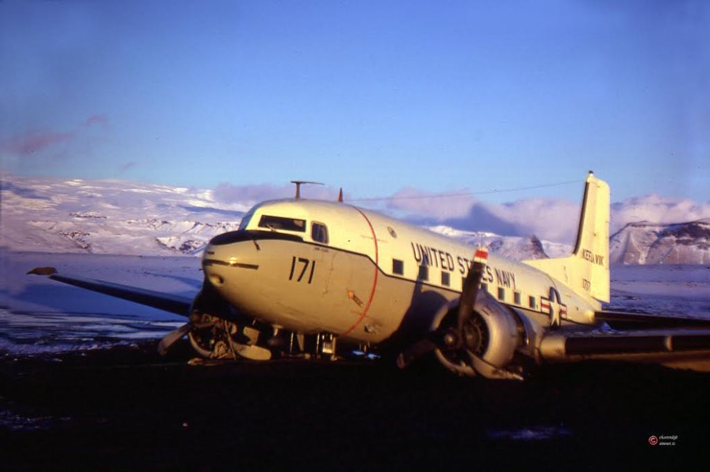 « J’étais un membre de l’équipage de sauvetage de Vik c’était le 21 novembre 1973 (et non le 24 comme on le lit partout dans les médias). L’avion provenait de Hofn in Hornafjörður. La raison du crash est que le carburant a gelé. Personne n’a été blessé, tous ont été rapatriés via l’hélicoptère de l’armée. L’une des photos montre le moment où l’hélicoptère atterrit. Nous avons aidé les Américains de plusieurs façons et plus tard ils nous ont donné tout l’essence qui s’était échappée de l’avion, et nous avons pu conduire nos motoneiges pour tout cet hiver 1973, ou deux hivers. Le vent d’ouest était très fort ce jour là, l’équipe de sauvetage a assuré. »