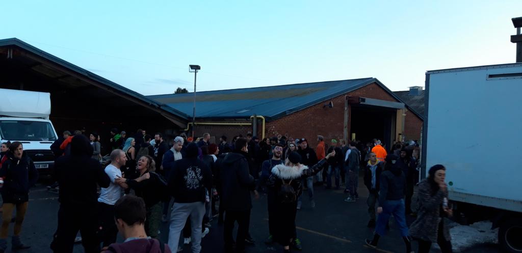 Dans une autre partie de l’usine, on trouve deux autres façades, celles des Anglais. Le style musical est plus typique British avec de la drum’n’bass, tribe, dubstep, jungle ou raggatek. À noter que nous sommes le week-end d’Halloween, on fête les morts, des visages maquillés et quelques déguisements déambulent pour ajouter une touche à cette soirée placée sous le signe de l’underground. Le site n’étant pas très grand, deux autres petits sons s’installent à l’extérieur, sur le parking.