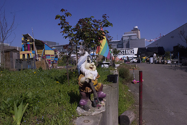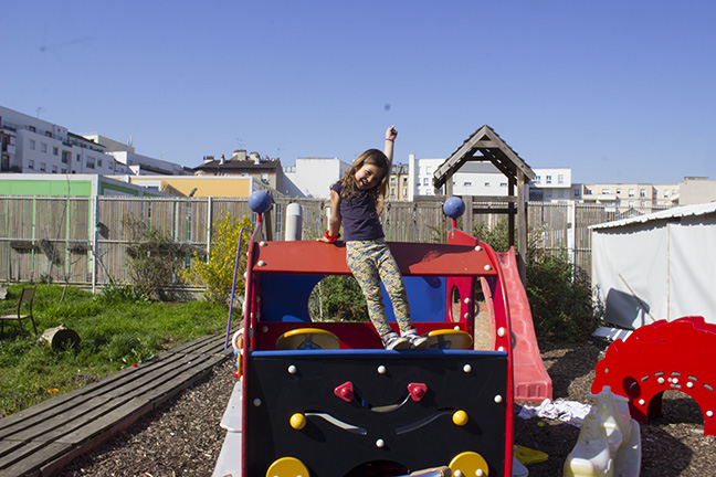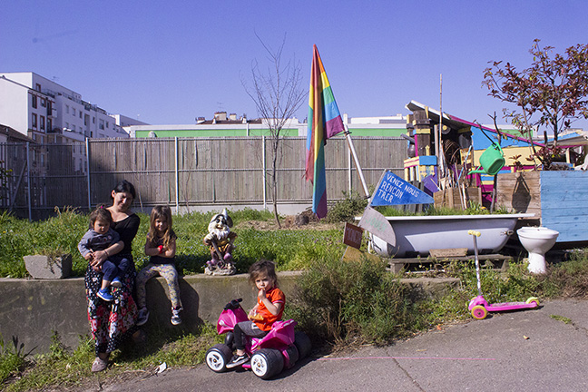 Tout l’espace occupé a été repris et embelli par les habitants. Dans la cour à l’entrée, a été installé avec précaution un véritable jardin pour enfants qu’envieraient tous les squares de Paris. Un grand potager, dont s’occupe toute la communauté, borde la clôture. Le parking sert d’emplacement pour des camions de voyageurs venus participer à la vie en communauté avant de repartir. Cet espace multiculturel où il fait bon vivre, sert de toit à plus de quarante personnes, de toutes générations, depuis plus de trois ans.