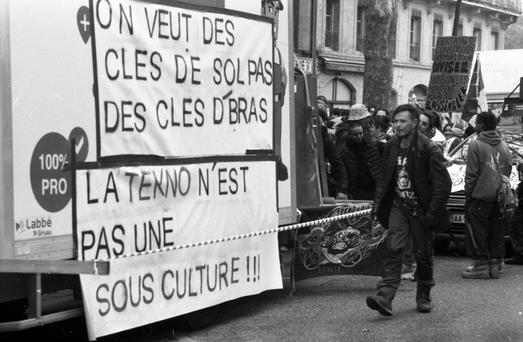 Jonathan B. , photographie le milieu des free party avec son appareil argentique. Pour Mouvances Libres il nous à déjà couvert la scandale party en 2018 en mode reporteuf. Véritable accro à son appareil argentique Nikon f 301 équipé de pellicules sfx 200 noir et blanc, il nous fait découvrir cette fois ci, la manifestive à Toulouse de soutien contre la répression des free party qui s’organise en Italie sous le nouveau gouvernement de Méloni. Elle s’est tenue au mois de décembre 2022, Avec ses mots et ses photos, il nous en parle !